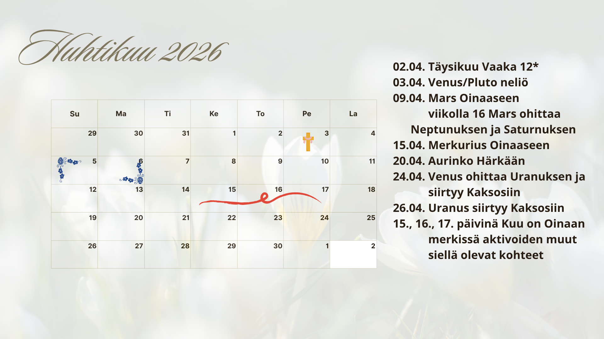 Vaakaan liitetään asioita kuten, diplomatia, rauha, tasapaino. Oinaan sotaisessa merkissä on paljon kävijöitä huhtikuussa. Täydenkuun kartalla Aurinko lähettää valoa Kuulle Oinaasta aivan kuin viestittäen täällä tarvitaan apua. Kuu on melko yksin toisella puolen eläinrataa ollen jänniteaspektissa Jupiteriin, joka voisi tässä tapauksessa antaa apua. Jupiter Ravussa edustaa kansalaisia, perheitä, sukuja. Millaista liikehdintää näemme, sen aika näyttää?